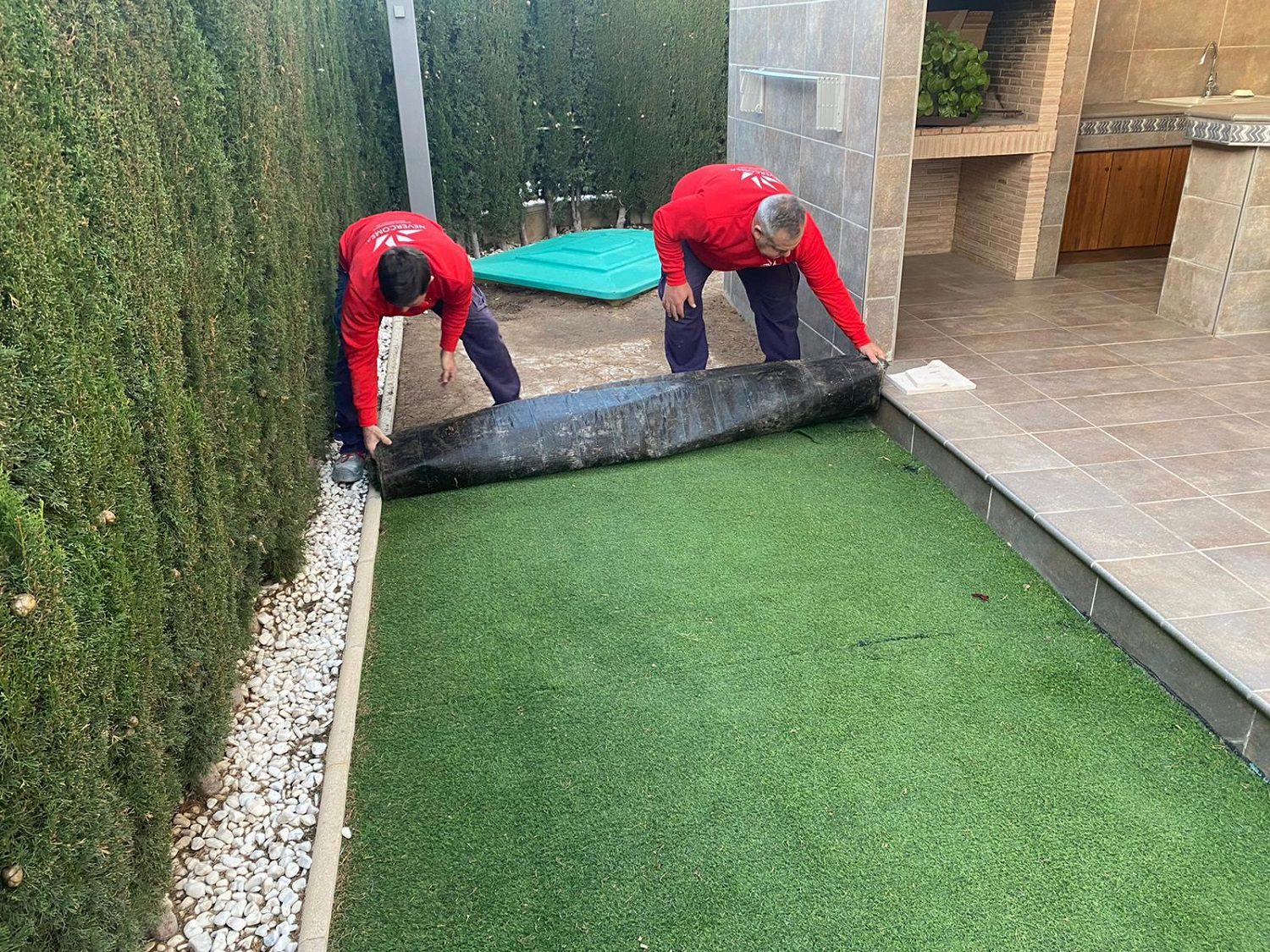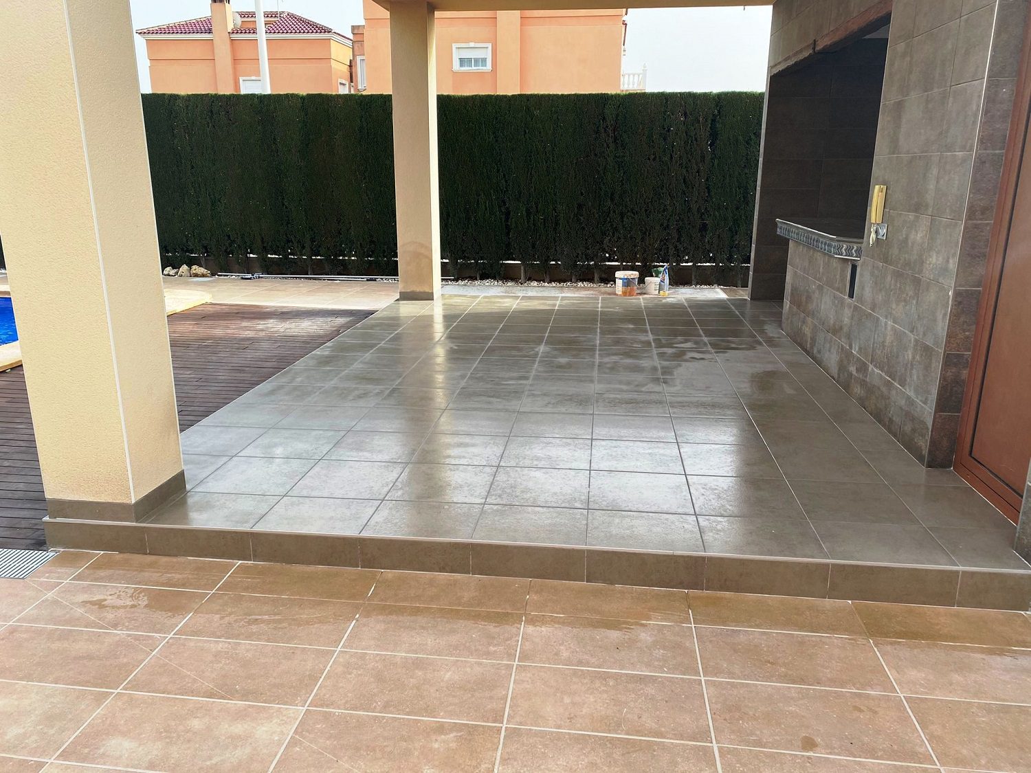 Acondicionamiento de zona de recreo junto a piscina mediante solado de gres en barbacoa y diversas zonas ajardinadas para dotarlo de mayor funcionalidad en Almoradí, Alicante
